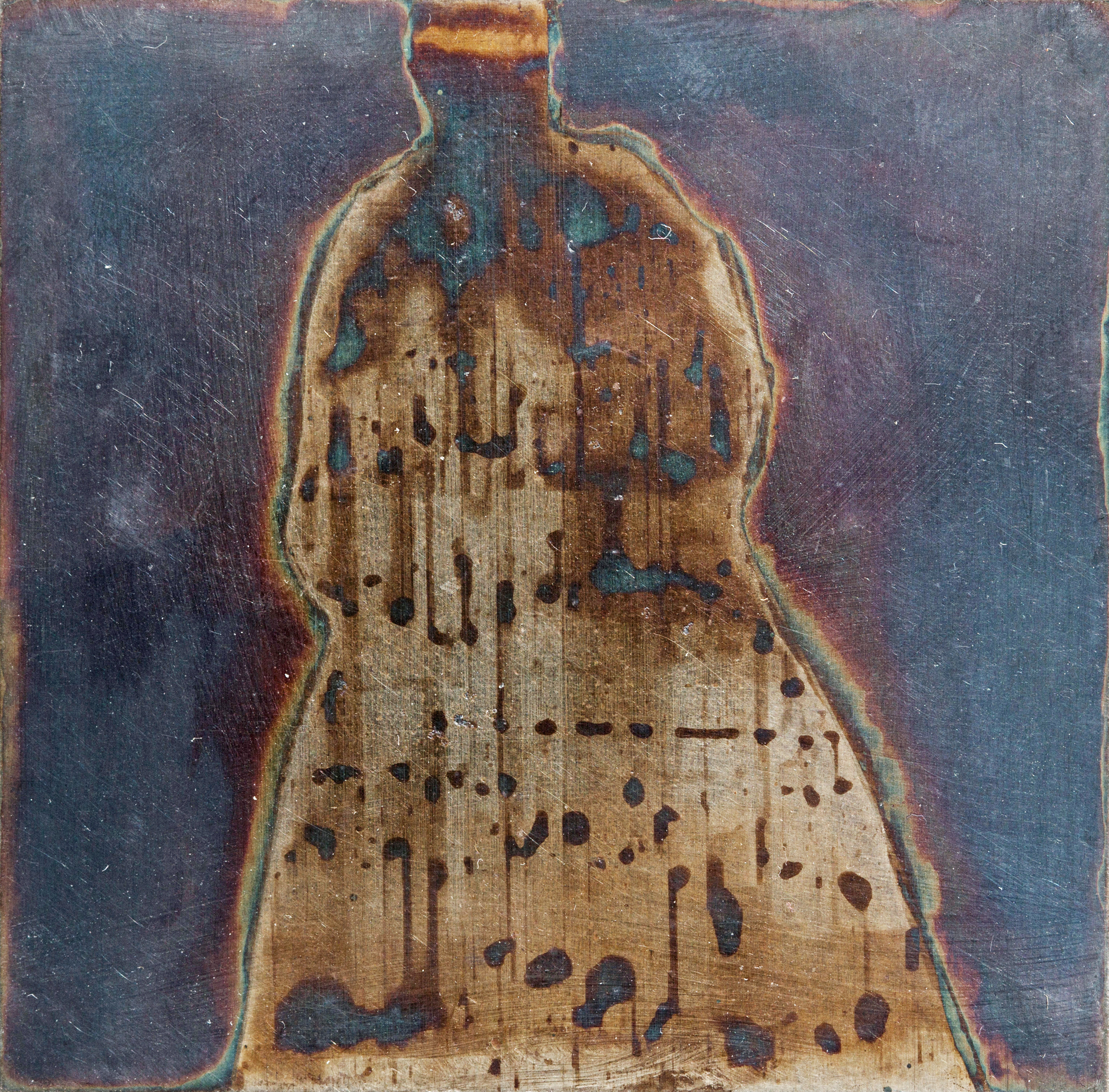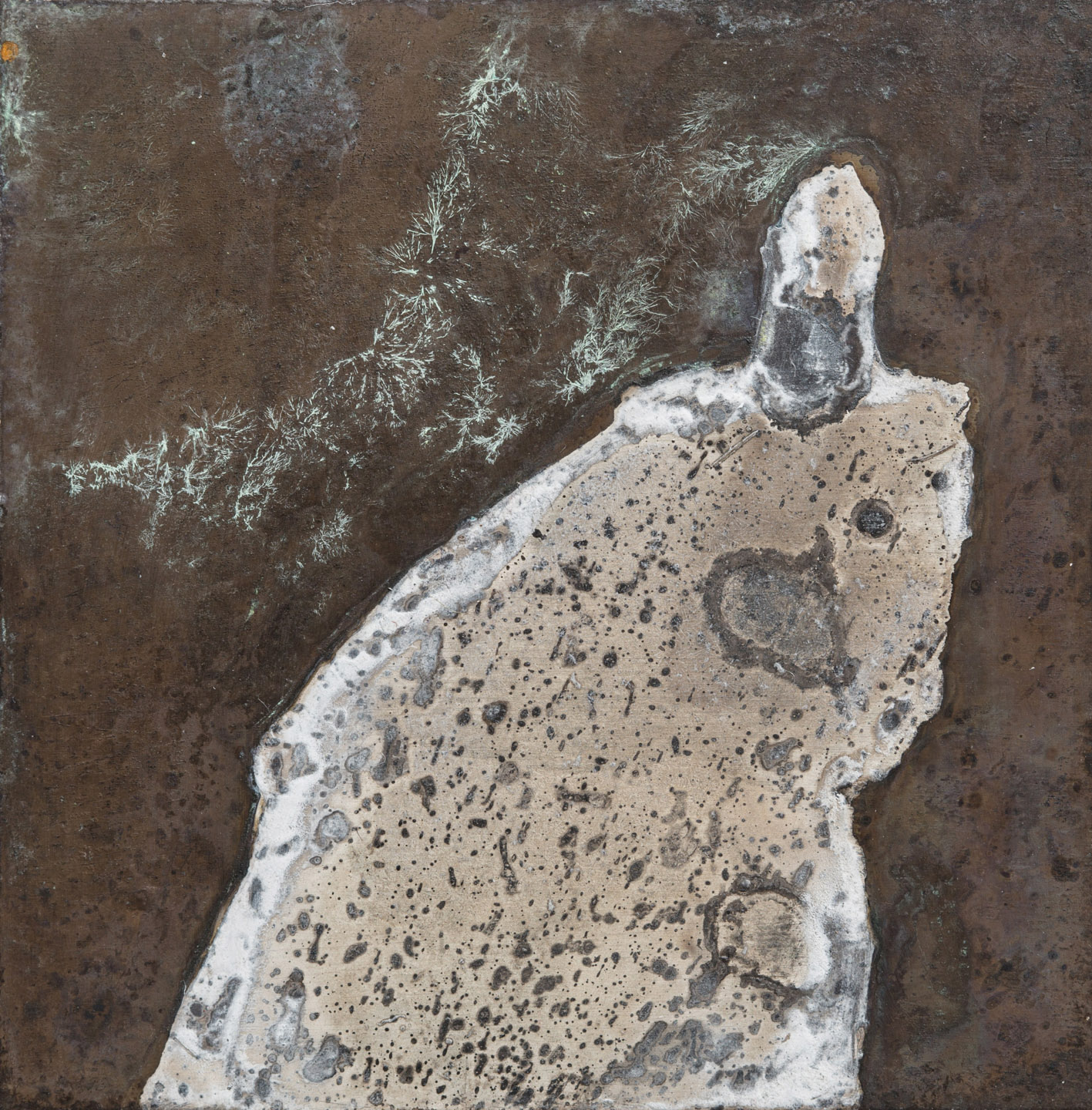 In these paintings entitled “Ghosts,” I oxidize sheet silver with a solution of liver or sulfur (sulfurated potash), with the occasional addition of oil paint. This oxidation process gives equal precedence to accident and control. The surfaces are protected with Renaissance Wax, a microcrystalline wax developed by the British Museum.